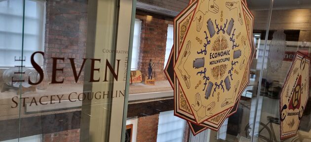 These seven pieces each represent one of the Cooperative Principles. The designs have been created using imagery, references, and ideas around the Co-operative Movement history incorporating artefacts from the National Co-operative Archive, C.W.S. packaging, logos, and other sources. Some of these include: